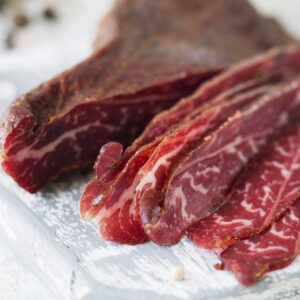 Відбірна в’ялена яловичина, трохи м‘якша по текстурі, з делікатною кількістю спецій, пікантна і дуже смачна! Це наш погляд на те, як має виглядати бастурма. Ще одна, неймовірно крута «проба пера» від нашого кума Юрка.