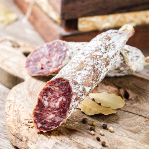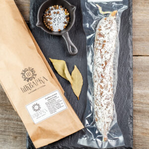 Склад: м’ясо кози знежиловане вищого ґатунку, свинина вільного вигулу в’єтнамської породи знежилована, сало свинне, сіль морська, вино, декстроза, чорний перець, лавровий лист, білий перець.