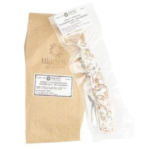 То є саме така ковбаса, яку давним-давно робили бабусі і прабабусі тих поліських майстрів, від яких наші куми перейняли ремесло. У цій трохи покрученій ковбасці немає нічого, окрім м’яса і натуральних спецій. Інколи трапляється зернятко чорного перцю чи дірка, що може утворитися від процесу осушення. Сухий білий наліт на паличках ковбаски – ознака витриманості і натурального походження. Це пеніцилінова їстівна цвіль, відома своїми антибактеріальними властивостями.