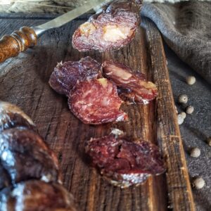 Склад: конина знежилована вищого сорту, кінський жир, сіль морська харчова, цукор білий, перець чорний мелений, часник свіжий, лавровий лист, зіра, нітрит натрію.